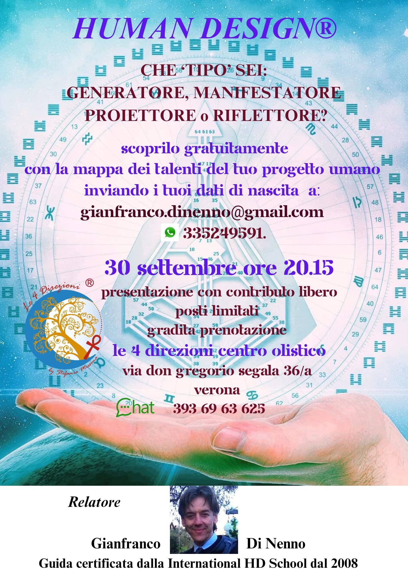 Durante la serata, il relatore Gianfranco Di Nenno, guida certificata dalla International HD School dal 2008, ti accompagnerà nella scoperta di questo strumento di consapevolezza.